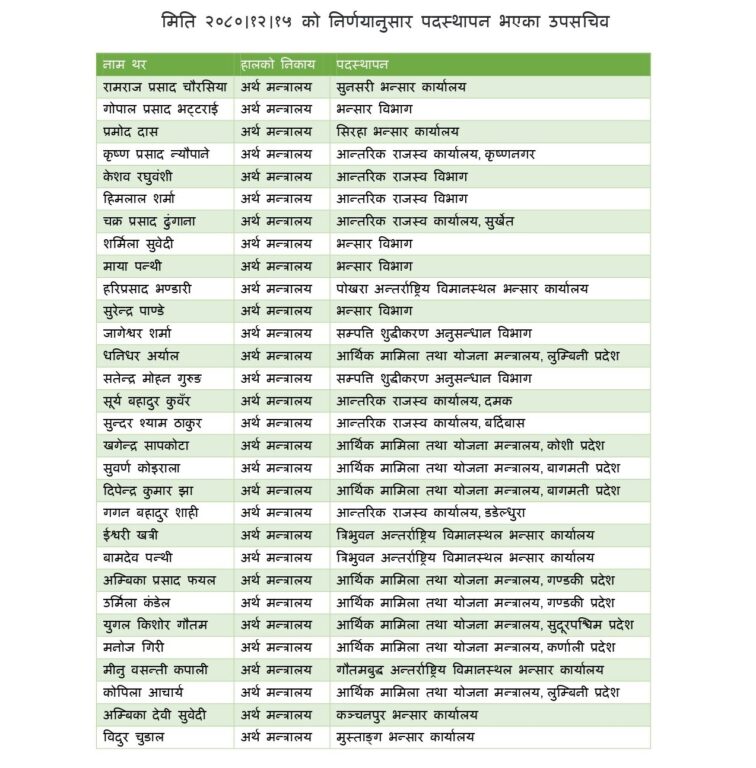 अर्थ मन्त्रालयका ३० जना उपसचिवको सरुवा, को कहाँ भए सरुवा ?