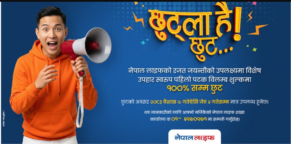 नेपाल लाइफले आफ्ना सम्पूर्ण बीमित महानुभावहरूलाई यस अवसरको सदुपयोग गर्दै बीमालेख नवीकरण गरी निरन्तर सुरक्षा सुनिश्चित गर्न हार्दिक अनुरोध गर्दछ ।