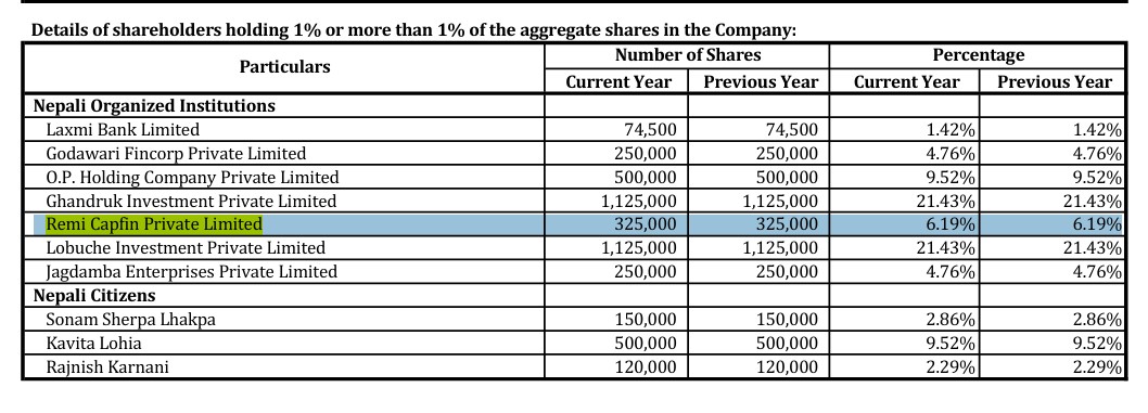 त्यस्तै,एउटा नाम चलेको अनलाइनको स्वामित्वमा रहेकाहरुको रेमी क्यापफिन प्रालिको पनि उक्त कम्पनीमा ३२ लाख ५० हजारको तीन लाख २५ हजार कित्ता सेयर रहेको लगतको ५६ नम्बरमा प्रष्टसँग लेखिएको छ । रेमी क्याफफिन अनलाइन खबर नेपालको स्वामित्वमा रहेको छ । यो कम्पनीमा सेयर रहेको लगतमा देखिन्छ । २०७९ भदौ २३ मा दर्ता भएको उक्त कम्पनीले उक्त अनलाइन सञ्चालन गर्दै आएको छ । यसले मिडियामा समेत दीपक भट्टले प्रभाव राखेको अर्थ लगाउन सकिन्छ ।