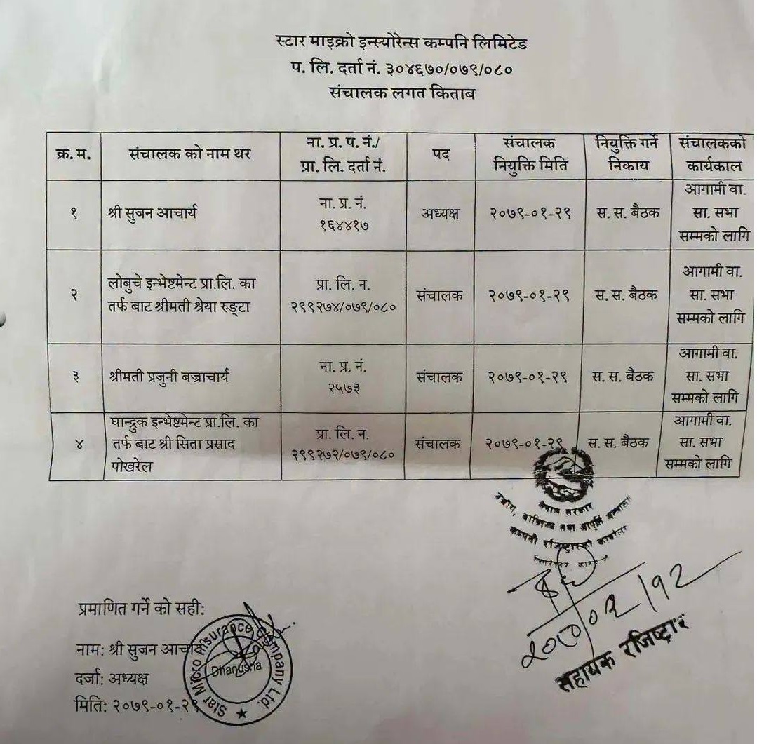 तर उनी सो समूहको लगानी रहेको कम्पनीकै साझेदार रहेको खुल्यो। भट्ट र शंकर समूहको लगानी रहेको स्टार माइक्रो इन्स्योरेन्स प्रालिमा सुधनको समेत लगानी रहेको खुल्यो। नेपाल बीमा प्राधिकरणमा आफू अनुकूल नेतृत्व लगेका उनीहरूले हिमालयन रीइन्स्योरेन्स लगायत स्टार माइक्रो इन्स्योरेन्स कम्पनीले समेत अनुमति पाएको थियो ।