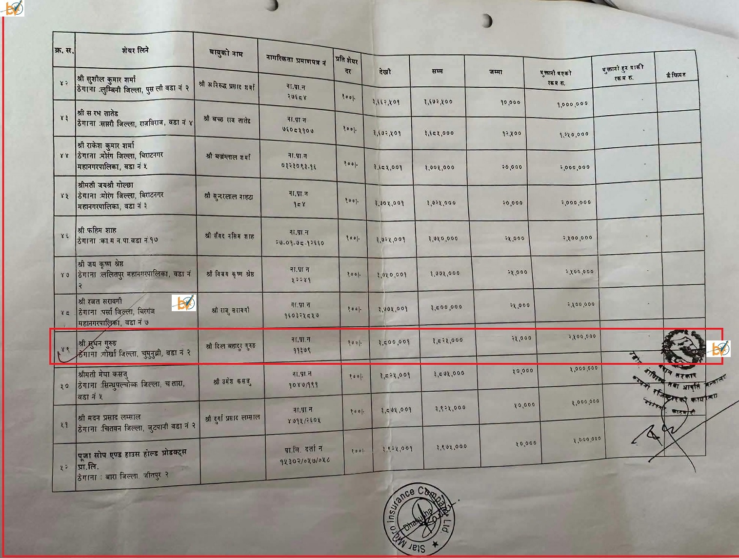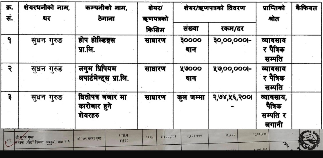 सेयर लगत किताबको क्रम संख्या ४९ नम्बरमा नाम उल्लेख भएका गुरुङको स्थायी ठेगाना चुमनुब्री वडा नम्बर २,गोरखा राखिएको छ । बाबुको नाम दिलबहादुर गुरुङ भएको उक्त विवरणका सेयरधनी प्रधानमन्त्री कार्यालयले अघिल्लो साता सार्वजनिक गरेको गृहमन्त्री सुधन गुरुङको व्यक्तिगत विवरणसँग पूर्ण मेल खान्छ ।